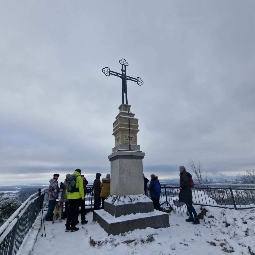 Bei frostigen Temperaturen ging es für 10 Freunde des Wanderns über einen Teil des Litermont-Gipfelpfades vom Parkplatz des Restaurants, oberhalb des eingefrorenen Froschteiches entlang, vorbei an der Mariengrotte, hin zur Viehweide oberhalb von Piesbach.