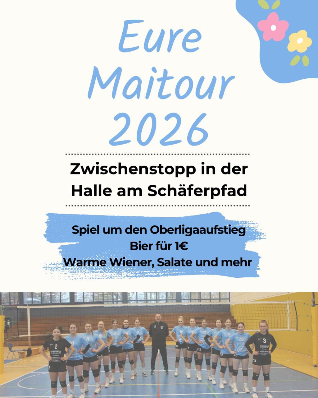 Legt auf eurer Maitour unbedingt einen Zwischenstopp bei uns in der Halle am Schäferpfad ein! Spielbeginn: 14 Uhr!
